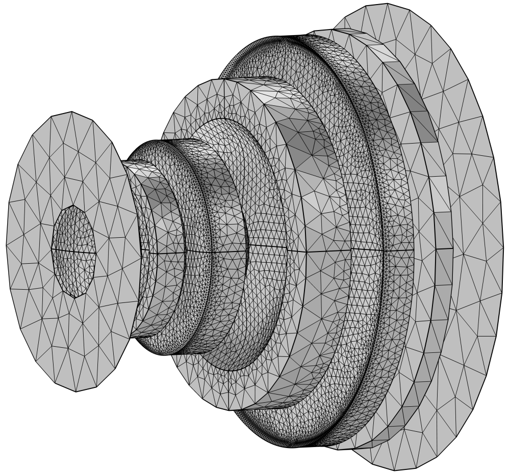 The mesh I used, shown above, employs a free triangular mesh for the optic faces, where I require the most precision, a physics-defined mesh, and a free tetrahedral mesh everywhere else. This mesh could be improved, but for this application, it is not overly fine and certainly works well enough.