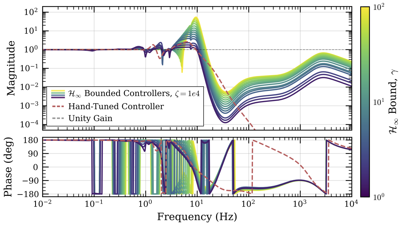 A key to making these controllers deployable is controlling gain peaking (and thus phase margin). The open-loop view shows how the controller shapes gain to suppress environmental disturbances at low frequency without over-exciting high-frequency sensor noise.