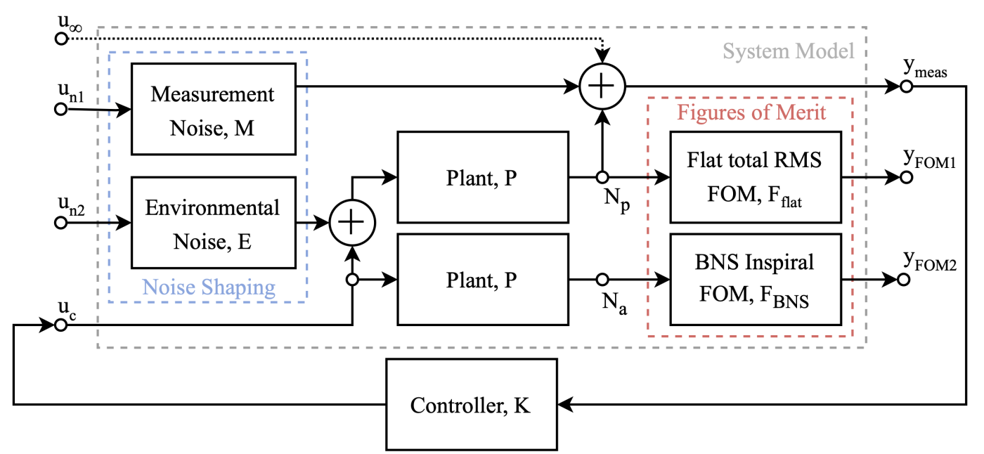 Caption: System model used for optimization. Noise enters as shaped “environmental” and “measurement” disturbances, flows through the plant and controller, and is evaluated by two figures of merit: (i) flat RMS for operational lock and (ii) BNS-weighted RMS for astrophysical reach.