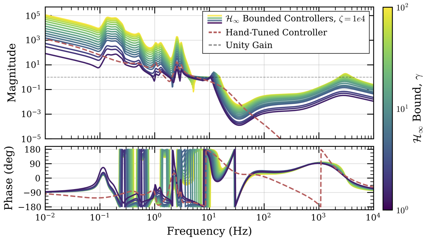 A key to making these controllers deployable is controlling gain peaking (and thus phase margin). The open-loop view shows how the controller shapes gain to suppress environmental disturbances at low frequency without over-exciting high-frequency sensor noise.