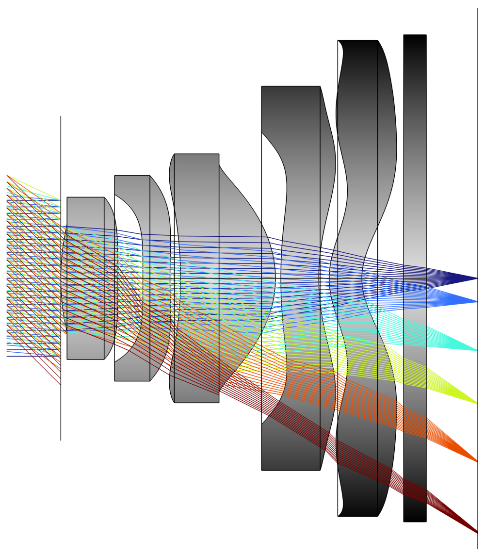 The image above shows the light coming from different angles, focusing on various points on the sensor, which is indicated by the black line on the right side of the picture. This 2D model provides a clear view of what is happening inside the camera. One point of note at this point is that all the blue rays focus to a single point on the sensor at 0°, while the light coming in at 45° (the dark red) appears to be slightly out of focus. This probably indicates that my values for some of the lens curvature might be slightly off; Although I am very impressed with how close I got with just the values from the patent. Now that you have a good picture in your mind of what happens in 2D, I will show you the 3D image.